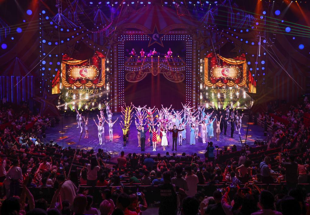 演員在第七屆中國國際馬戲節(jié)參演節(jié)目A場展演后集體謝幕(11月5日攝)。新華社記者 劉大偉 攝
