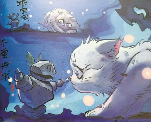 繪本故事中,石磯娘娘住的山里闖進了一只小貓咪,魔鏡告訴她高大的樣子可能會嚇到貓咪,于是她就變成小石頭人的樣子與貓咪成了好朋友(見上圖),她還給小貓咪起名叫“虎子”。有一天她和貓咪玩耍的時候碰見了一只野獸,為了保護小貓咪,她恢復了高大的樣貌嚇跑了野獸,也嚇跑了“虎子”。于是石磯娘娘又變成了孤身一人,直到有天小貓回來,告訴她自己找到了媽媽,真的要離開山里了,石磯娘娘則含淚與小貓做了正式的告別。暖心的故事看哭了很多觀眾。
