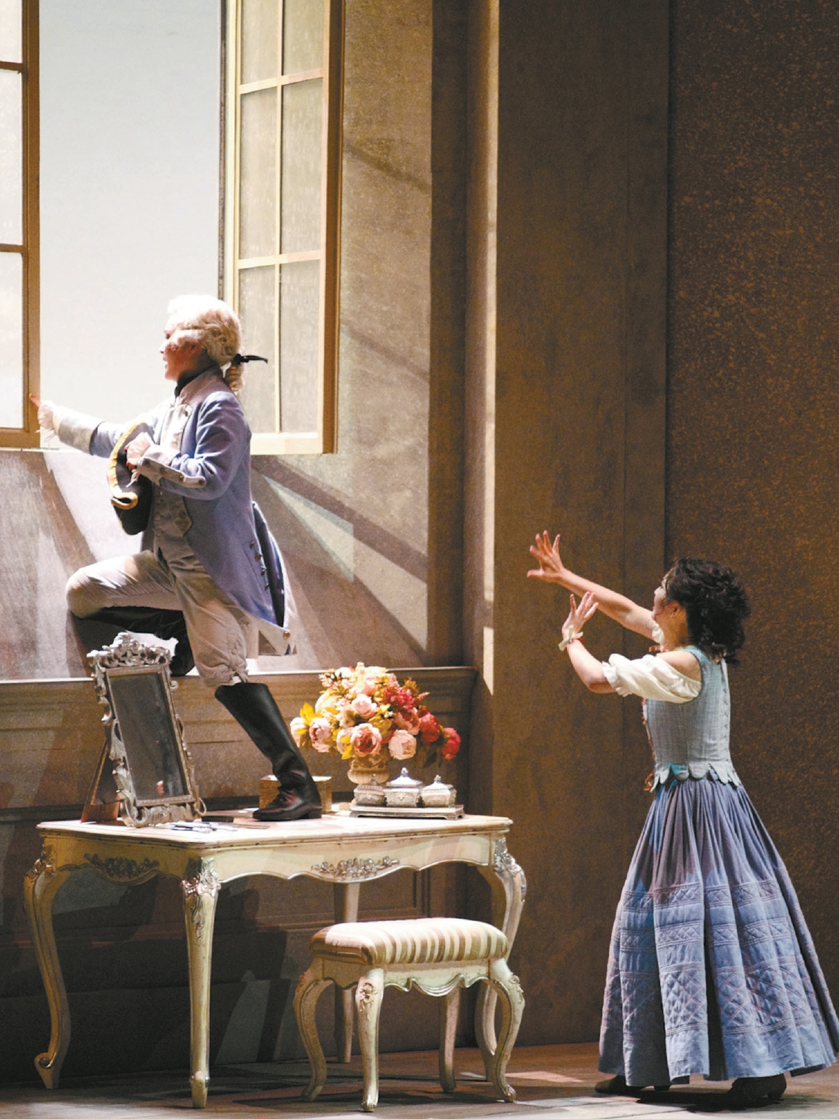 奧地利男中音馬庫斯·維爾巴飾演的費(fèi)加羅一登場便贏得滿堂喝彩。他以渾厚圓潤的音色與精湛的表演技巧,將這位機(jī)智勇敢的男仆形象刻畫得入木三分。在詠嘆調(diào)“如果你想跳舞”中,維爾巴與國家大劇院合唱團(tuán)的默契配合將劇情推向首個高潮,合唱團(tuán)飽滿和諧的和聲為音樂增添了絢麗色彩。第一幕結(jié)尾處,維爾巴演唱的著名詠嘆調(diào)“再不要去做情郎”以明快有力的旋律與溫柔勸導(dǎo)的宣敘調(diào)交替呈現(xiàn),生動展現(xiàn)了費(fèi)加羅幽默風(fēng)趣與堅(jiān)定勇敢的雙重性格,鏗鏘有力的演唱贏得全場掌聲雷動。