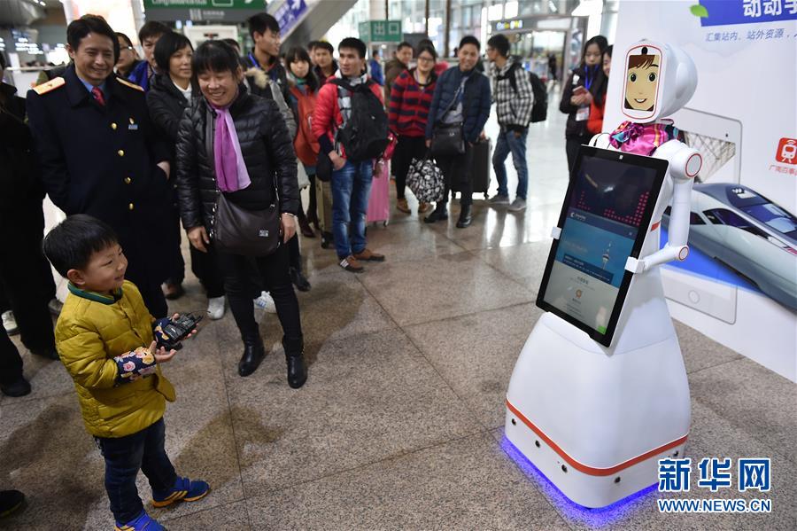 2月1日,旅客們?cè)趶V州南站與智能機(jī)器人“小璐”對(duì)話。當(dāng)日,一臺(tái)名叫“小璐”的智能機(jī)器人亮相廣州南站,吸引了大批旅客的圍觀,大家紛紛嘗試與“小璐”對(duì)話,向她咨詢列車時(shí)刻、購(gòu)票信息、天氣情況等問(wèn)題,“小璐”不僅可以用甜美的女聲一一作答,還可以在接收到語(yǔ)音指令后,為旅客“唱歌”和“跳舞”。據(jù)了解,使用智能機(jī)器人服務(wù)旅客是廣州南站在今年春運(yùn)中的新嘗試,如果試用效果良好,今后有望在車站中看到更多智能機(jī)器人的身影。新華社記者 梁旭 攝