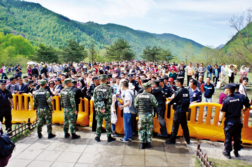 5月18日深夜,隨著三個入山口人流的驟增,原定22時30分上崗的民警提前到20時全部到位。23時40分,記者來到南線游客中心,只見潮水般的人群涌向售票大廳,不少公安民警在安監(jiān)門口嚴密把守,有序放行,站在臺階上的民警手舉超大口徑的大喇叭向嘈雜擁擠的人海不斷地呼喊:“不要擁擠,有序排隊!”在游客中心東邊的交通要道上,全副武裝的交通民警正在緊張地疏導川流不息的車輛。19日1時燈光下,記者看到擔任此次安??傊笓]的市公安局局長楊梅喜在寒風中與民警一道指揮交通。