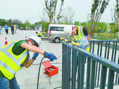 上午9時(shí),安裝工作正在進(jìn)行,大約20只“小金鳥”陸續(xù)進(jìn)入最后的焊接階段?,F(xiàn)場施工負(fù)責(zé)人郭中戌師傅告訴記者,“和原來那批相比,小鳥的牢固程度增加了三倍以上?!庇浾呖吹剑X制鳥身下方連接著一個(gè)長而細(xì)的不銹鋼管,鋼管穿透護(hù)欄,欄桿上方的部分噴膠,欄桿下邊的部分?jǐn)Q緊螺絲后再加一層焊接。