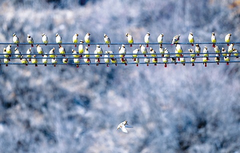 從去年10月下旬開始,有大量的小太平鳥進(jìn)入沁源縣境內(nèi),主要棲息在靈空山自然保護(hù)區(qū)、菩提山森林公園等地,到今年2月下旬,鳥群逐漸增多。本周以來(lái),已有近萬(wàn)只小太平鳥棲息于沁源縣境內(nèi),場(chǎng)面頗為壯觀,為綠色沁源又增添了一道亮麗的風(fēng)景。圖為3月28日沁源縣境內(nèi)拍攝的一群小太平鳥。