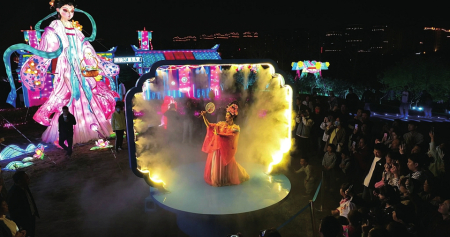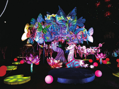在百花的傳說中,十二月令花神的傳說最令人神往。在桃花島上,梅花、杏花、桃花、牡丹、石榴、蓮花、蜀葵、桂花、菊花、木芙蓉、山茶、水仙,各路花神身著華服,在所屬花燈前翩翩起舞,燈光人影交織,盡顯浪漫。“十二花神”每晚分時段在桃花云臺,跳起如云似幻的祈福舞,笑容明媚,面若桃紅,傾倒眾人。無人機組集合成孔明燈形狀,載著每個人最虔誠的心愿緩緩升空?!笆ㄉ瘛彪S即走下“神臺”,出沒在各個角落,讓整個桃花島亦真亦幻。穿行其中,與“花神”擦肩而過,仿佛穿越時空,進入神話世界。