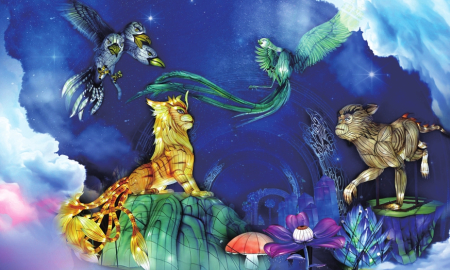 奇幻風(fēng)格的桃花路上,《山海經(jīng)》中的仙山海景和祥瑞神獸也來助陣。渾身毛發(fā)雪白的九尾狐,三頭六尾名叫鵸的鳥妖、吼聲震天名叫狌狌的犲山獸、立于昆侖山巔遙望東方的陸吾、三首六尾夜半怪笑的鵸鵌、悠然自得的麋鹿、充滿神秘色彩的青鸞、抬腿準備騰云的飛馬……置身其中,仿佛斗轉(zhuǎn)星移,滄海桑田。地面的點點星光,營造出神秘夢幻的奇趣山海世界。