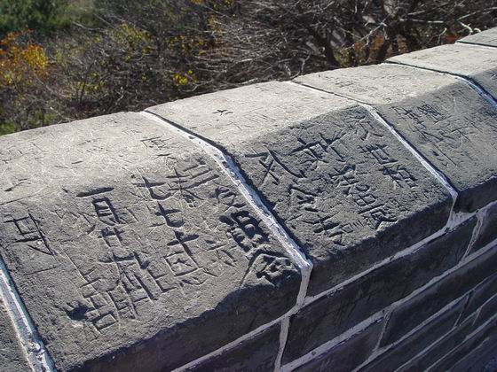 游客在北京八達嶺長城城墻頂部刻的字(2005年11月攝)。新華社發(fā)(鄭嚴(yán)攝)
