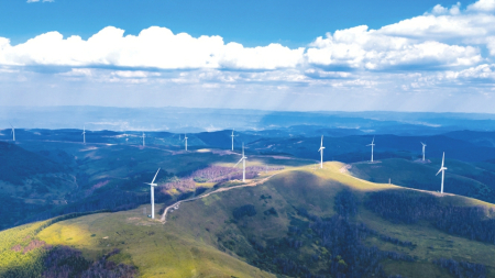 3.花坡景區(qū)聳立的風電機組與綠草甸交相輝映,美不勝收。