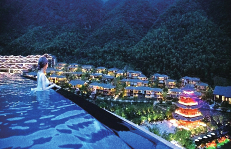 徜徉泳池,可觀落日余暉、滿天星辰,一邊是古風古韻的漢唐建筑,一邊是綠意正濃的山林竹間;一半是封存塵世的自然風景,一半是觸手可及的浪漫風情。俯瞰葛仙村,盡享古韻之美。傍晚,落日余暉均勻曬在水面上,散為金光,而晚霞,也幻成異樣的色彩,一層層的光和色,相互交融著,“落霞與孤鶩齊飛,秋水共長天一色”的意境就是如此吧。夜里輕柔的晚風,拂過泳池,水波粼粼,被周邊的燈光映襯得就像無數(shù)的水晶鋪設在水面上,星空與池底交相呼應,帶來無盡的浪漫氣息。