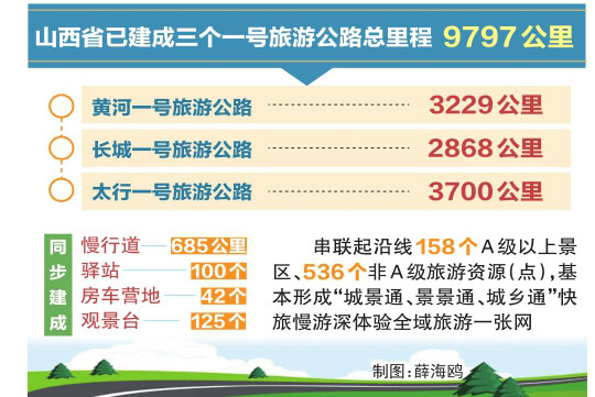 截至今年10月10日,山西省已建成三個一號旅游公路總里程9797公里。其中,黃河一號旅游公路3229公里、長城一號旅游公路2868公里、太行一號旅游公路3700公里,同步建成慢行道685公里、驛站100個、房車營地42個、觀景臺125個,串聯(lián)起沿線158個A級以上景區(qū)、536個非A級旅游資源(點),基本形成“城景通、景景通、城鄉(xiāng)通”快旅慢游深體驗全域旅游一張網(wǎng)。