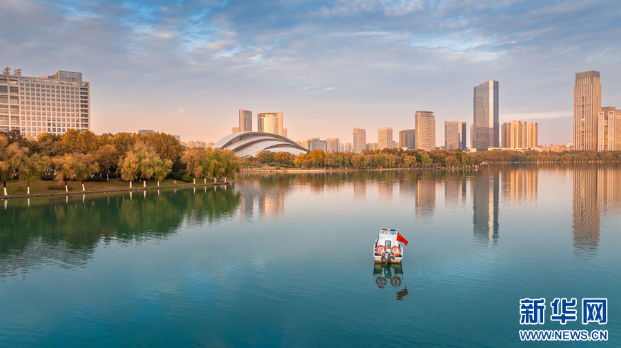 近日,在安徽省合肥市政務(wù)區(qū)天鵝湖畔,層林盡染,景色旖旎。周?chē)臉?shù)木、建筑物,與清澈的湖水交相輝映,渲染成一幅色彩斑斕的迷人畫(huà)卷。新華網(wǎng)發(fā)(劉玉才 攝)
