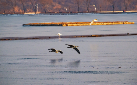 冬日的太原市汾河濕地公園生機(jī)盎然,鳥兒翔集。
