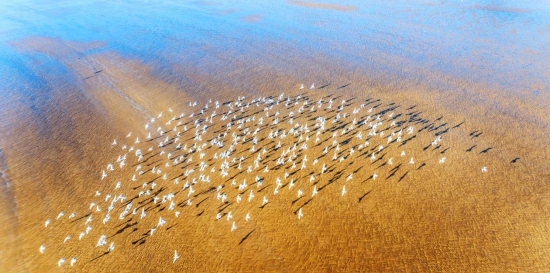 一群海鷗掠過金沙灘,為海面帶來了生機(jī)和活力。新華網(wǎng)發(fā)(陳光金 攝)