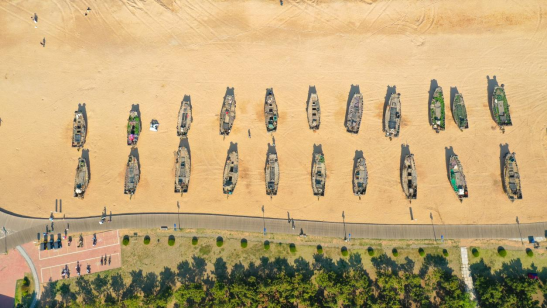 漁船整齊排放在沙灘上。新華網(wǎng)發(fā)(卜凡文 攝)