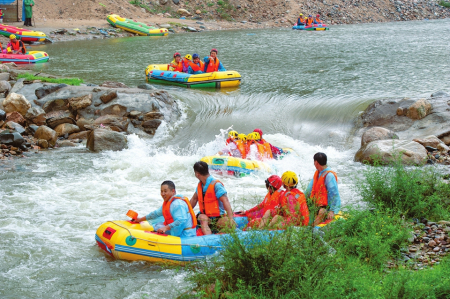 體驗(yàn)完水上樂(lè)園后,張子良一行乘車(chē)來(lái)到位于中莊村的龐泉溝激情漂流。剛下車(chē)就看到了碼頭上熱鬧的景象,一艘艘漂流艇上坐滿(mǎn)了前來(lái)體驗(yàn)的游客,大家穿著救生衣在工作人員的護(hù)送下向下漂流。偶爾遇到一處急流險(xiǎn)灘,漂流艇隨著奔騰的水流飛馳而起,一眨眼的工夫就已落到了下一個(gè)平潭區(qū),游客們發(fā)出了陣陣尖叫。一路刺激,一路驚心,漂流給游客們留下了深刻的印象。負(fù)責(zé)該項(xiàng)目的閔玉貴介紹,項(xiàng)目選取了文峪河最精華的10公里河道,累計(jì)落差130米,平均水深0.8米,河道時(shí)寬時(shí)窄,水流時(shí)急時(shí)緩,沿途既有急流險(xiǎn)灘,又有緩流碧潭,由于經(jīng)過(guò)了精心設(shè)計(jì),且河道兩岸安排了上百名安全員護(hù)航,可以確保有驚無(wú)險(xiǎn)。