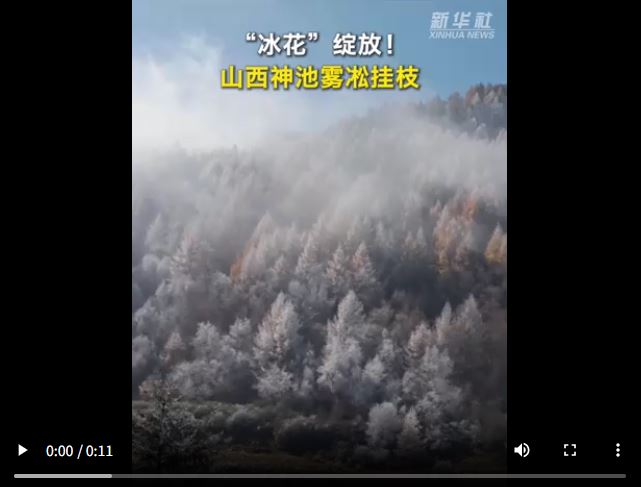 初冬時(shí)節(jié),山西神池國(guó)家登山步道出現(xiàn)霧凇景觀。金色的樹枝上掛滿冰晶,微風(fēng)徐來(lái),霧凇輕盈搖曳,還有牛羊在山坡上悠閑地吃草。霧凇宛如一層白色的薄紗,將整個(gè)森林籠罩其間,如夢(mèng)如幻。