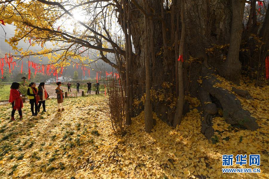11月19日,游客在留壩縣玉皇廟鎮(zhèn)參觀千年銀杏樹。初冬時節(jié),在秦嶺深處的陜西省留壩縣玉皇廟鎮(zhèn)石窯壩村,一棵千年古銀杏樹的落葉宛如金色地毯,甚為壯觀。據(jù)當?shù)亓謽I(yè)部門介紹,該樹胸徑為4.45米,現(xiàn)有高度29米。新華社記者 陶明 攝