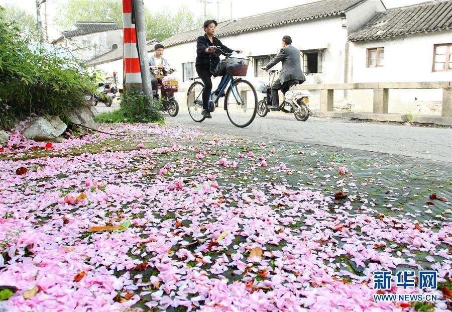 4月17日,一場春雨過后,蘇州市民騎車經(jīng)過落滿櫻花的盛家?guī)?。新華社發(fā)(王建中 攝)