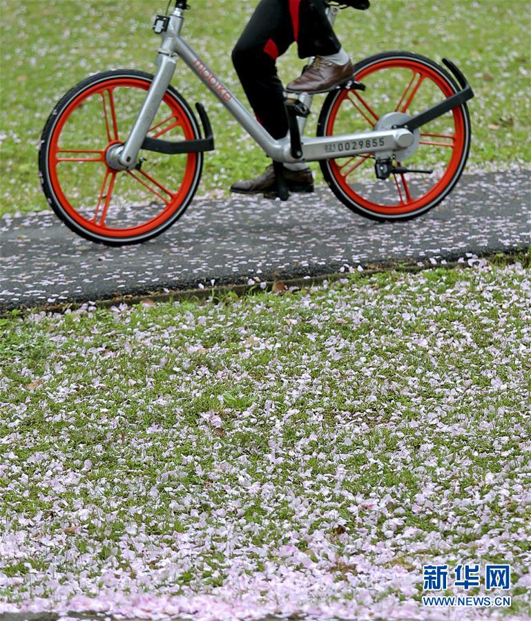 4月17日,一場春雨過后,一名游客在落滿花瓣的浙江省嘉興市南湖風(fēng)景區(qū)內(nèi)騎行。 新華社發(fā)(金鵬 攝)