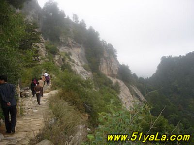 北武當(dāng)山主峰四周幾乎都是陡壁懸崖,只有一條人造“天梯”可攀。來(lái)到山腳下,過(guò)五里黃土、五里沙路,便是1400余級(jí)就山鑿筑的石階,凡險(xiǎn)峻之處,設(shè)有鐵索扶手。石階一線疊置,從下仰視,宛如“天梯”。游人攀登,每一步都可聽(tīng)到悠揚(yáng)頓挫的“石音”,形成獨(dú)特的“石樂(lè)”絕景。沿著石階,奇松異石、廟宇石刻,掩沒(méi)在蔥郁的山林植被之中,相間點(diǎn)綴,相映成趣。主要的山石景觀有:古猿望日、石豬受難、九龍出洞、石象守山、天壺傾露、石羊朝圣、石龜下蛋、石虎、石蛤蟆、龜蛇斗智等。最令人稱(chēng)奇的是“龜蛇斗智”奇觀,相傳神龜和青蛇不安心修道,互相格斗,經(jīng)過(guò)七七四十九天的麈戰(zhàn),神龜節(jié)節(jié)敗退,青蛇步步緊逼。其時(shí),恰逢真武大帝返宮,見(jiàn)狀,輕輕用手指一點(diǎn),龜蛇便動(dòng)彈不得,從此永久停留在這里,成千古一絕——“蛇石”虎視眈眈,“龜石”尾臨懸崖,萬(wàn)斤重石,峭立崖畔,用力一推或經(jīng)風(fēng)一吹,便搖搖欲墜,令人心懸,所以又稱(chēng)風(fēng)動(dòng)石,為我國(guó)罕見(jiàn)的景觀之一。主要的奇松景觀有:鴛鴦松、迎客松、托天松、母子松等。最使人嘆為觀止的是“擎天探海松”,其松立于石階半道,樹(shù)身技分兩杈,一直刺青天,一枝瞰群峰。近金頂?shù)悄咸扉T(mén)石階,旁邊陡崖上刻有“喬松”二字,據(jù)載為清代道光年間永寧州牧王繼賢手跡?,F(xiàn)存喬松樹(shù)樁直徑近1米,可以想見(jiàn)其昔日雄姿。主要的懸崖峭壁有:千仞壁、舍身崖、鷹嘴崖等。還有呈垂直分布的植被,其色彩和花期隨季節(jié)變化,給北武當(dāng)山披上了“春粉、夏艷、秋紅、冬白”的盛裝。登臨武當(dāng)之巔,一覽眾山,但見(jiàn)遠(yuǎn)山蒼茫,近日含黛,松風(fēng)撲面,白云飄逸;只聞松濤陣陣,山泉潺潺,鳥(niǎo)語(yǔ)唧唧,似琴弦輕撥;夏秋之季,如晴空萬(wàn)里,金頂之下,叢林景觀相間,似七彩織錦;白云遠(yuǎn)處,群山連綿,猶如萬(wàn)龍翻騰,極為壯觀。