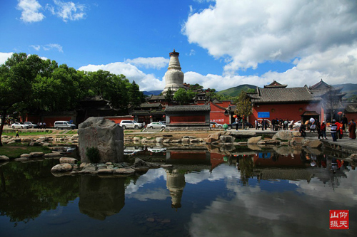 臺(tái)懷鎮(zhèn)鎮(zhèn)北有一小峰,人稱靈鷲峰,亦名菩薩頂。所以稱之為靈鷲峰,是因?yàn)樗牡乩硇蝿?shì)頗似古印度摩揭陀國(guó)王舍城東北部釋迦牟尼佛說(shuō)法的靈鷲峰故名。據(jù)佛教史籍記載,東漢時(shí)期,我國(guó)佛教最初的傳播人攝摩騰和竺法蘭來(lái)到臺(tái)懷鎮(zhèn),見(jiàn)今菩薩頂?shù)男蝿?shì)頗似印度的靈鷲峰,因而命名之。所以也稱靈鷲峰為菩薩頂,佛教徒傳說(shuō)文殊菩薩曾在峰頂顯靈和說(shuō)法。
