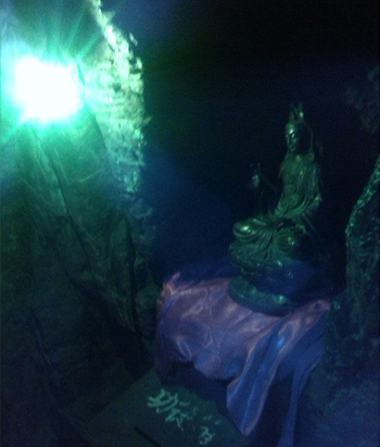 千佛洞,分內(nèi)外兩洞,外洞大而明,內(nèi)洞小而幽,中間有一個扁圓形孔穴相通。內(nèi)洞中,可以容納五至七人。內(nèi)洞的洞壁上,山巖經(jīng)水溶化,產(chǎn)生許多乳石及石筍,夾有各種色質(zhì),猶如人體心肝五臟,洞形又呈葫蘆形狀,后人便稱之為母腹。佛教宣揚(yáng)進(jìn)入小洞就是投胎佛母,受其恩育,復(fù)出小洞就是洗掉人生一切煩惱,獲得無上歡樂幸福。
