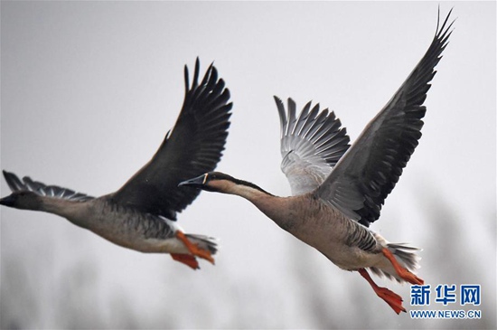11月29日,候鳥在江西鄱陽(yáng)湖南磯濕地國(guó)家級(jí)自然保護(hù)區(qū)飛翔。近日,大批南遷候鳥飛抵鄱陽(yáng)湖棲息越冬。