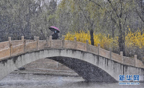 4月3日,市民在延慶區(qū)一個公園中賞雪。當(dāng)日,華北中部地區(qū)氣溫驟降,位于燕山山脈腳下的北京市延慶區(qū)降下一場春雪。 新華社記者 李欣 攝