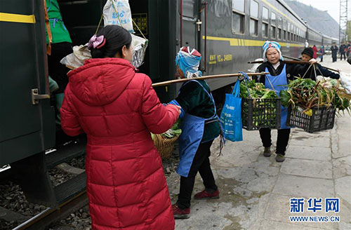 1月27日,乘客挑著擔(dān)子登上5639次列車。 由貴州玉屏開往貴陽的5639次列車是輛綠皮“慢火車”。沿途群眾每天挑著籮筐上車,將自家出產(chǎn)的農(nóng)作物帶到貴陽、凱里等地販賣,再坐著火車把生產(chǎn)資料和日用品帶回家。時間一長,不少乘客直接在列車上買賣貨物。春節(jié)將至,蔬菜水果等農(nóng)產(chǎn)品交易較往日更加紅火,列車上的“年貨市場”洋溢著濃濃年味。 新華社發(fā)(許毅 攝)
