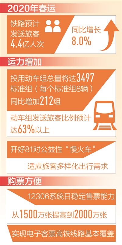國(guó)鐵集團(tuán)相關(guān)負(fù)責(zé)人介紹,2020年鐵路春運(yùn)自1月10日開(kāi)始,2月18日結(jié)束,共40天,節(jié)前15天,節(jié)后25天。鐵路部門(mén)安排節(jié)前每日開(kāi)行旅客列車5275對(duì),運(yùn)輸能力達(dá)到1010萬(wàn)人;節(jié)后每日開(kāi)行旅客列車5410對(duì),運(yùn)輸能力達(dá)到1043萬(wàn)人。