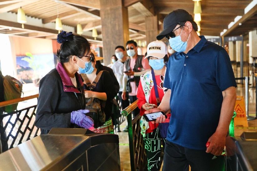 游客嚴(yán)格執(zhí)行疫情防控制度進行核驗后進入景區(qū)。