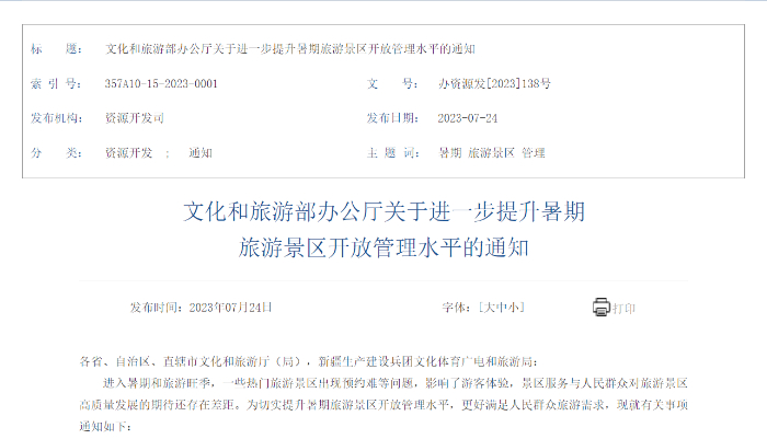 近日,文化和旅游部網站發(fā)布“關于進一步提升暑期旅游景區(qū)開放管理水平的通知”,從優(yōu)化預約管理、強化彈性供給、推動產品創(chuàng)新、提升服務質量、實施錯峰調控、規(guī)范市場秩序、嚴守安全底線、強化宣傳引導八方面作出部署。