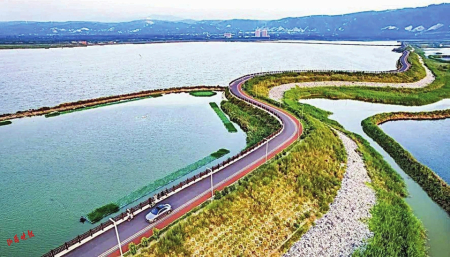 鴨子池位于運城鹽湖以東,歷史上為保護鹽池而建,總面積4.7平方公里。近年來,隨著鴨子池水生態(tài)綜合提升工程的實施,這里逐漸形成集蓄水、滯洪、生態(tài)于一體的原生生態(tài)濕地系統(tǒng),處處水清草肥、景色宜人。來到池東新修的大壩觀景臺,兩側(cè)水域煙波浩渺,將全線貫通的鴨子池環(huán)湖路與一堰之隔的七彩鹽湖環(huán)湖路相連,一幅天人合一的大美勝景令人心曠神怡。
