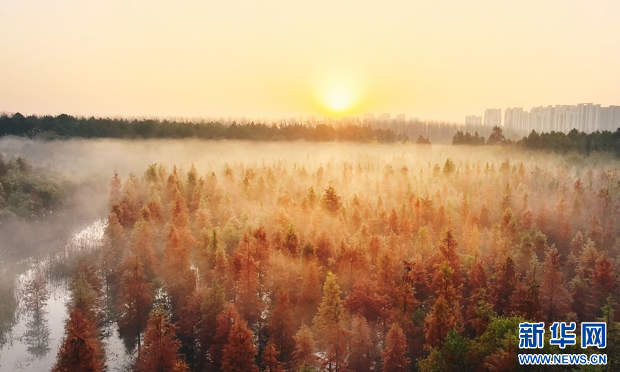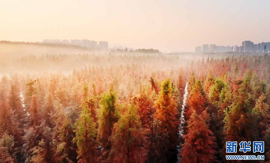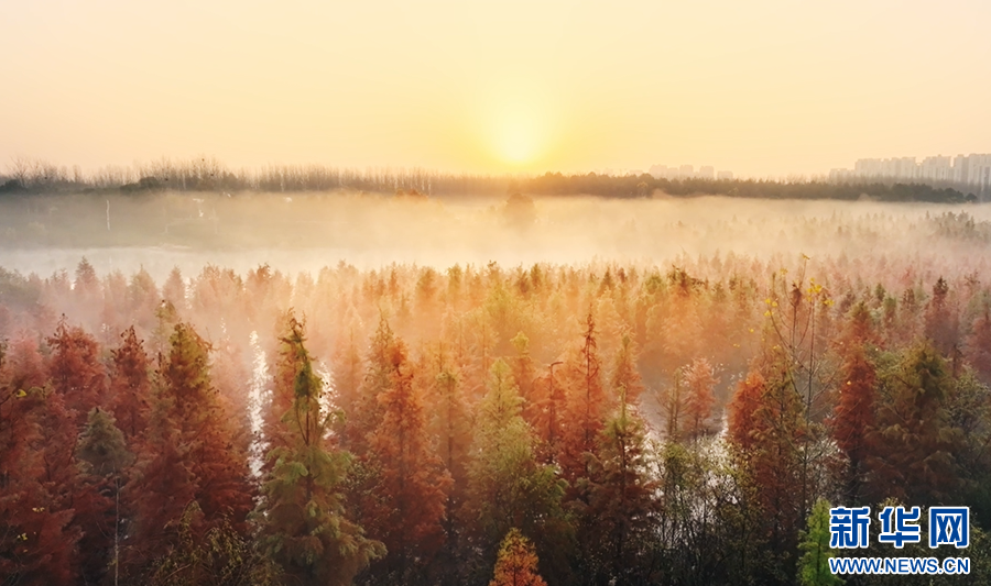 近日,在安徽省合肥市董鋪水庫,大片紅杉林迎來最佳觀賞期。從空中俯瞰,紅色的樹影倒映在綠水之上,讓人陶醉。新華網(wǎng)發(fā)(江河 攝)