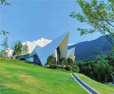 露臺(tái)遠(yuǎn)眺,終于見(jiàn)到“帳篷客”的真模樣。碧藍(lán)的天空與草地相得益彰,群山之間,一朵朵白色帳篷式的建筑接山連地,仿若林間精靈,或流暢、或筆挺的線條拋向空中,既有徽派民居的美,還有隱蔽的生態(tài)山野風(fēng)光。這些“長(zhǎng)”在山林里的建筑,順著大地的脈絡(luò)而棲,與湖泊、草坪相伴,不知從哪里始,也不知從何處終?;张梢饩硰纳揭把由斓绞覂?nèi),以現(xiàn)代手法重構(gòu)淡雅古樸,讓山居生活多了一份詩(shī)意。