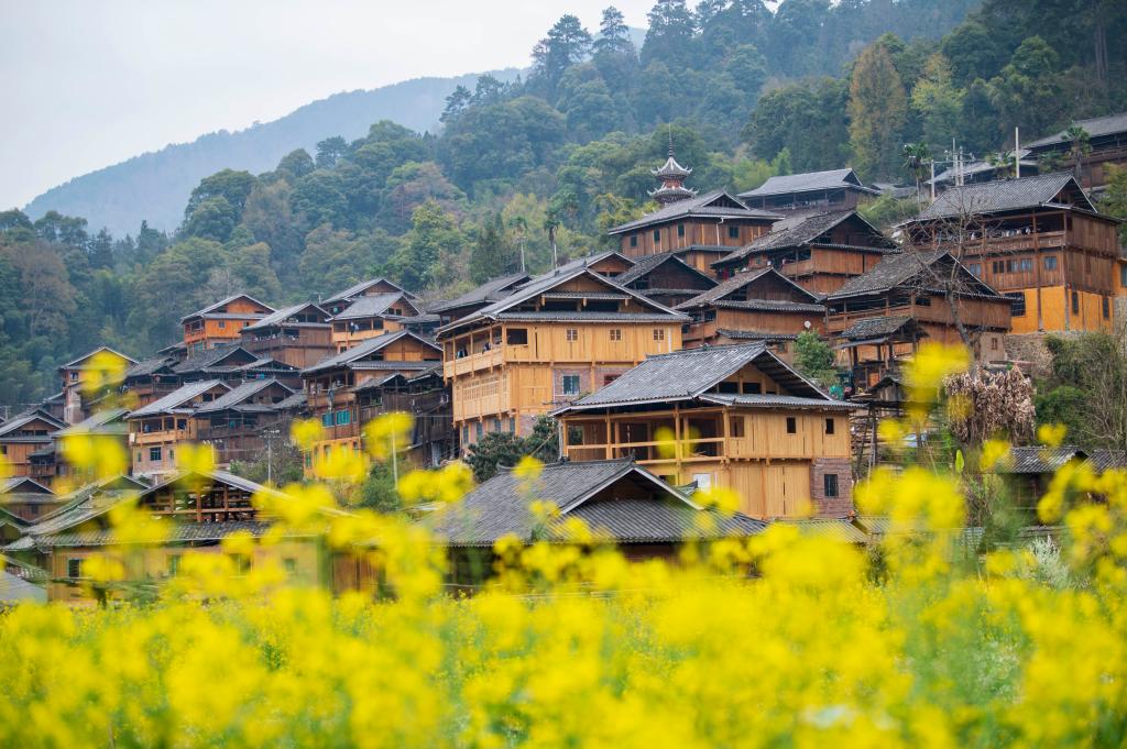 ?? 2024年3月10日,貴州省從江縣高增鄉(xiāng)占里侗寨內(nèi)盛開(kāi)的油菜花與鼓樓、民居相映成景。CICPHOTO/吳德軍 攝