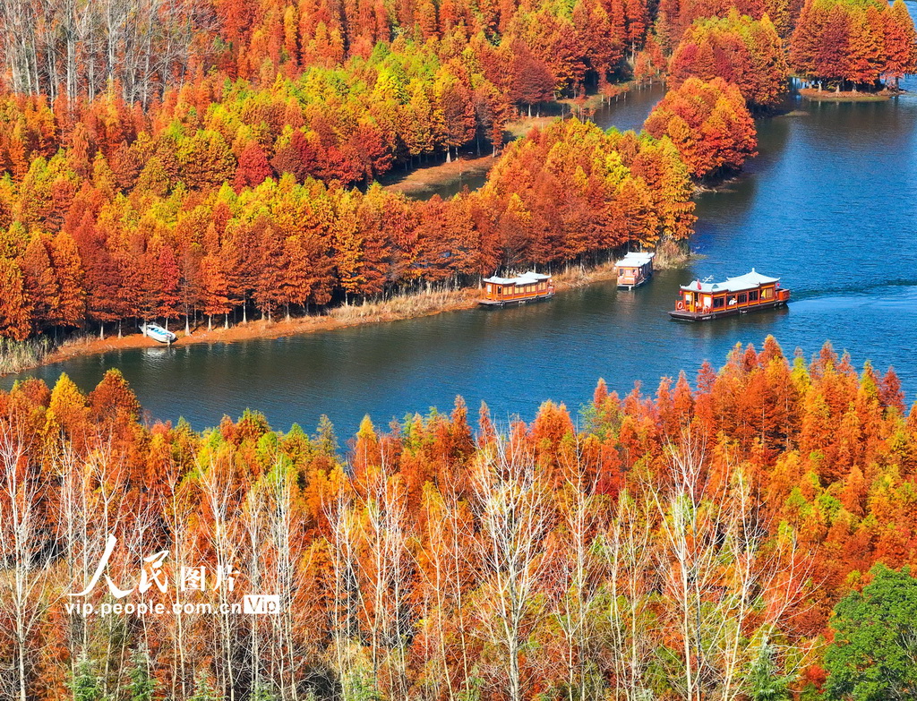 初冬時(shí)節(jié),江蘇省淮安市盱眙縣天泉湖色彩斑斕,落羽杉林枝葉飄紅,與碧水相映成趣,構(gòu)成一幅美麗的冬日生態(tài)畫卷。方東旭攝(人民圖片網(wǎng))