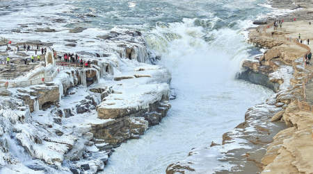 1月11日,人們?cè)诩h黃河壺口瀑布拍照游玩。連日來,受冷空氣影響,吉縣黃河壺口瀑布形成壯美“冰瀑”景觀,吸引大量游客前來賞景。