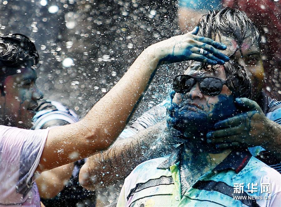 胡里節(jié)也叫“灑紅節(jié)”,人們?cè)谧约耗樕虾蜕砩贤可项伭?,還向別人拋撒五顏六色的顏料和粉末,迎接春天的到來(lái)。新華社發(fā)(吳昂 攝)