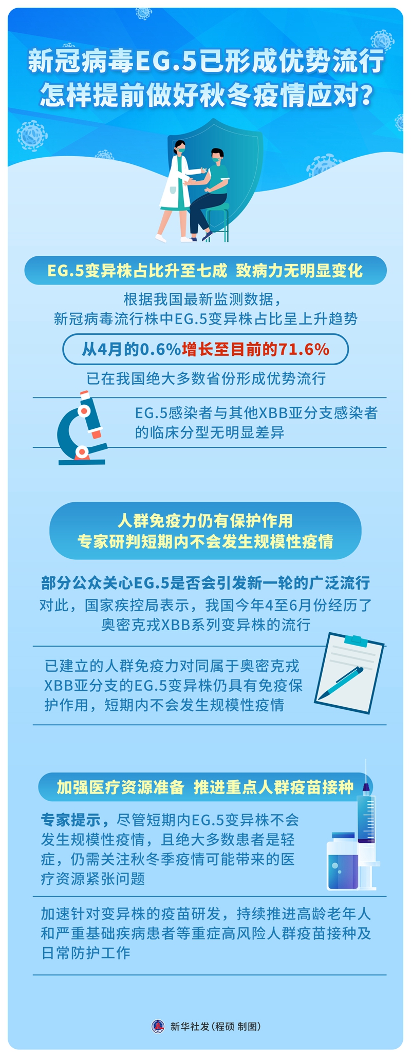 專家提示,盡管短期內(nèi)EG.5變異株不會發(fā)生規(guī)模性疫情,且絕大多數(shù)患者是輕癥,仍需關(guān)注秋冬季疫情可能帶來的醫(yī)療資源緊張問題,加速針對變異株的疫苗研發(fā),持續(xù)推進高齡老年人和嚴重基礎(chǔ)疾病患者等重癥高風險人群疫苗接種及日常防護工作。