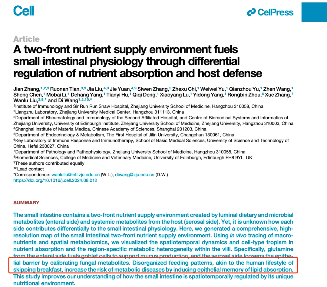 日前,浙江大學(xué)醫(yī)學(xué)院附屬邵逸夫醫(yī)院、浙江大學(xué)愛丁堡大學(xué)聯(lián)合學(xué)院、中國科學(xué)院上海藥物研究所的研究團(tuán)隊(duì),在頂尖學(xué)術(shù)期刊《細(xì)胞》(Cell)上合作發(fā)表一篇論文表明,不吃早餐的這種飲食習(xí)慣會(huì)改變小腸對營養(yǎng)物質(zhì)的吸收方式,從而會(huì)增加代謝性疾病的風(fēng)險(xiǎn)。