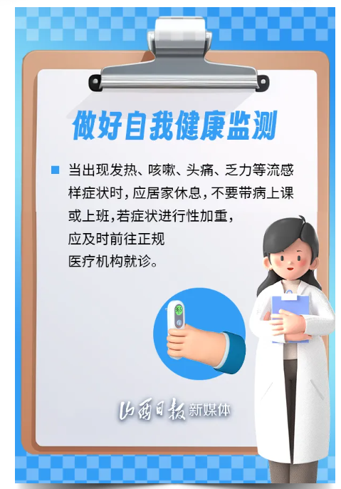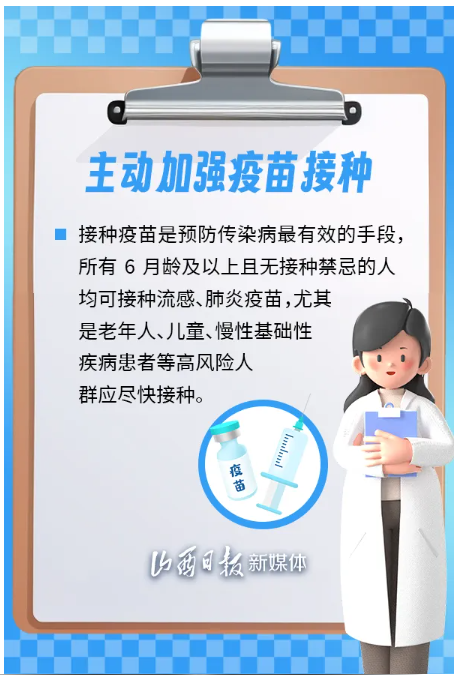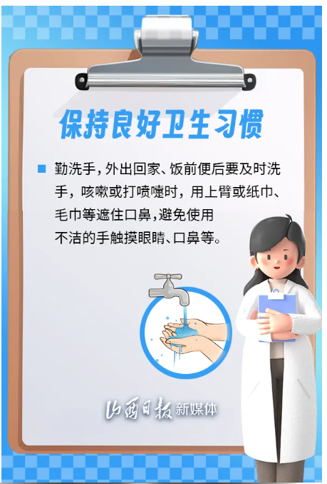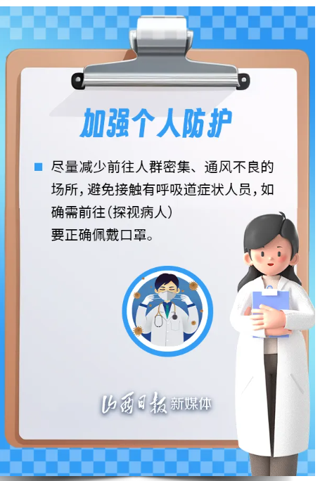 為保護(hù)公眾身體健康,有效應(yīng)對傳染病疫情,山西省衛(wèi)健委、省疾控局溫馨提示,建議公眾加強(qiáng)個人防護(hù),科學(xué)佩戴口罩,保持良好衛(wèi)生習(xí)慣,健康安全度過這個冬季。