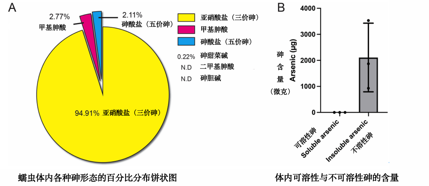 A:蠕蟲(chóng)體內(nèi)各種砷形態(tài)的百分比分布;B:體內(nèi)可溶性與不可溶性砷的含量