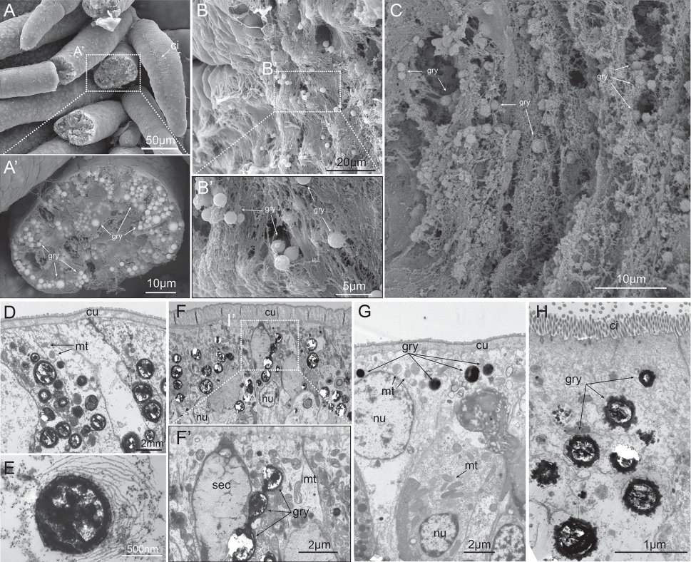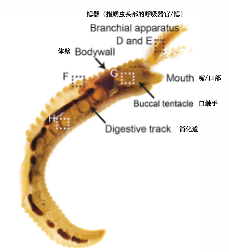 通過(guò)顯微鏡觀察,科學(xué)家發(fā)現(xiàn)蠕蟲(chóng)的上皮細(xì)胞中充滿了直徑0.77-1.29微米的黃色顆粒。這些顆粒不僅存在于體表,還分布在鰓、口觸手和消化道中——所有與海水直接接觸的部位。