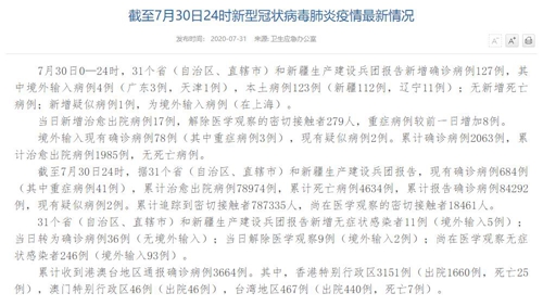 人民網(wǎng)北京7月31日電(董童)國(guó)家衛(wèi)生健康委于今日在官網(wǎng)發(fā)布的《截至7月30日24時(shí)新型冠狀病毒肺炎疫情最新情況》(以下簡(jiǎn)稱(chēng)“情況”)提出,7月30日0—24時(shí),31個(gè)?。ㄗ灾螀^(qū)、直轄市)和新疆生產(chǎn)建設(shè)兵團(tuán)報(bào)告新增確診病例127例,其中境外輸入病例4例(廣東3例,天津1例),本土病例123例(新疆112例,遼寧11例);無(wú)新增死亡病例;新增疑似病例1例,為境外輸入病例(在上海)。當(dāng)日新增治愈出院病例17例,解除醫(yī)學(xué)觀察的密切接觸者279人,重癥病例較前一日增加8例。