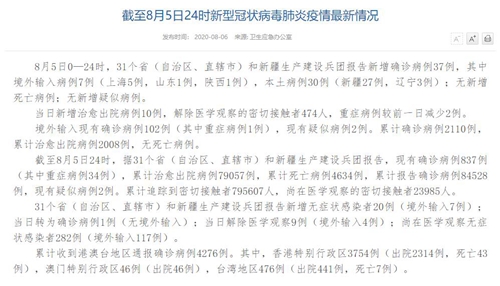 情況顯示,截至8月5日24時(shí),據(jù)31個(gè)?。ㄗ灾螀^(qū)、直轄市)和新疆生產(chǎn)建設(shè)兵團(tuán)報(bào)告,現(xiàn)有確診病例837例(其中重癥病例34例),累計(jì)治愈出院病例79057例,累計(jì)死亡病例4634例,累計(jì)報(bào)告確診病例84528例,現(xiàn)有疑似病例2例。累計(jì)追蹤到密切接觸者795607人,尚在醫(yī)學(xué)觀察的密切接觸者23985人。