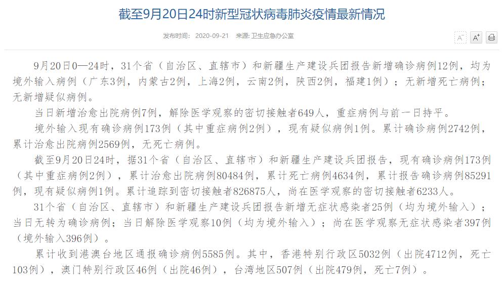 人民網(wǎng)北京9月21日電(董童)國家衛(wèi)生健康委于今日在官網(wǎng)發(fā)布的《截至9月20日24時新型冠狀病毒肺炎疫情最新情況》(以下簡稱“情況”)提出,9月20日0—24時,31個省(自治區(qū)、直轄市)和新疆生產(chǎn)建設(shè)兵團(tuán)報(bào)告新增確診病例12例,均為境外輸入病例(廣東3例,內(nèi)蒙古2例,上海2例,云南2例,陜西2例,福建1例);無新增死亡病例;無新增疑似病例。當(dāng)日新增治愈出院病例7例,解除醫(yī)學(xué)觀察的密切接觸者649人,重癥病例與前一日持平。