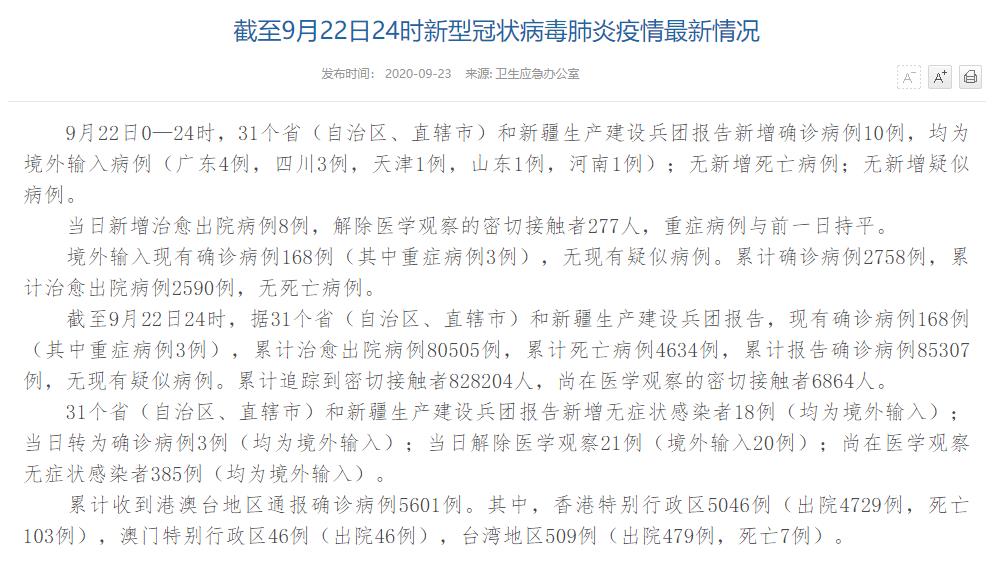 人民網(wǎng)北京9月23日電(董童)國家衛(wèi)生健康委于今日在官網(wǎng)發(fā)布的《截至9月22日24時(shí)新型冠狀病毒肺炎疫情最新情況》(以下簡稱“情況”)提出,9月22日0—24時(shí),31個(gè)省(自治區(qū)、直轄市)和新疆生產(chǎn)建設(shè)兵團(tuán)報(bào)告新增確診病例10例,均為境外輸入病例(廣東4例,四川3例,天津1例,山東1例,河南1例);無新增死亡病例;無新增疑似病例。當(dāng)日新增治愈出院病例8例,解除醫(yī)學(xué)觀察的密切接觸者277人,重癥病例與前一日持平。