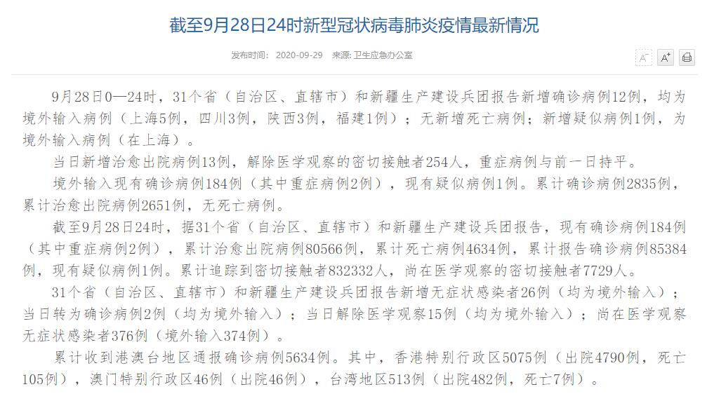 人民網(wǎng)北京9月29日電(董童)國(guó)家衛(wèi)生健康委于今日在官網(wǎng)發(fā)布的《截至9月28日24時(shí)新型冠狀病毒肺炎疫情最新情況》(以下簡(jiǎn)稱“情況”)提出,9月28日0—24時(shí),31個(gè)?。ㄗ灾螀^(qū)、直轄市)和新疆生產(chǎn)建設(shè)兵團(tuán)報(bào)告新增確診病例12例,均為境外輸入病例(上海5例,四川3例,陜西3例,福建1例);無(wú)新增死亡病例;新增疑似病例1例,為境外輸入病例(在上海)。當(dāng)日新增治愈出院病例13例,解除醫(yī)學(xué)觀察的密切接觸者254人,重癥病例與前一日持平。