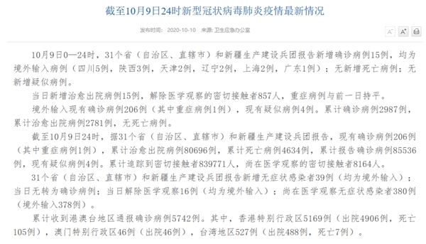 人民網(wǎng)北京10月10日電(許曉華)國家衛(wèi)生健康委于今日在官網(wǎng)發(fā)布的《截至10月9日24時(shí)新型冠狀病毒肺炎疫情最新情況》(以下簡(jiǎn)稱“情況”)提出,10月9日0—24時(shí),31個(gè)省(自治區(qū)、直轄市)和新疆生產(chǎn)建設(shè)兵團(tuán)報(bào)告新增確診病例15例,均為境外輸入病例(四川5例,陜西3例,天津2例,遼寧2例,上海2例,廣東1例);無新增死亡病例;無新增疑似病例。當(dāng)日新增治愈出院病例15例,解除醫(yī)學(xué)觀察的密切接觸者857人,重癥病例與前一日持平。