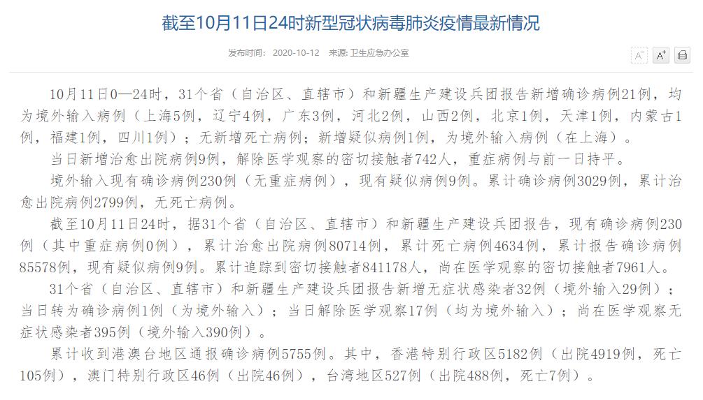 人民網(wǎng)北京10月12日電(董童)國家衛(wèi)生健康委于今日在官網(wǎng)發(fā)布的《截至10月11日24時(shí)新型冠狀病毒肺炎疫情最新情況》(以下簡(jiǎn)稱“情況”)提出,10月11日0—24時(shí),31個(gè)省(自治區(qū)、直轄市)和新疆生產(chǎn)建設(shè)兵團(tuán)報(bào)告新增確診病例21例,均為境外輸入病例(上海5例,遼寧4例,廣東3例,河北2例,山西2例,北京1例,天津1例,內(nèi)蒙古1例,福建1例,四川1例);無新增死亡病例;新增疑似病例1例,為境外輸入病例(在上海)。當(dāng)日新增治愈出院病例9例,解除醫(yī)學(xué)觀察的密切接觸者742人,重癥病例與前一日持平。